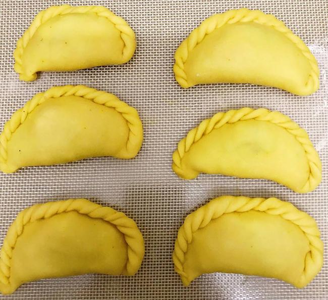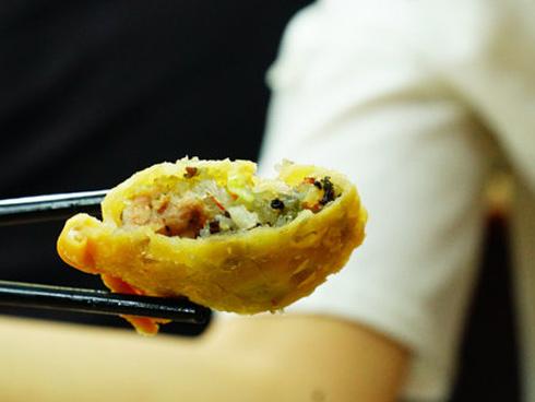- Bạn xếp vỏ bánh, quét một lớp mỏng lòng đỏ trứng gà quanh mép vỏ bánh gối. Tiếp đến bạn cho phần nhân vào giữa và đặt miếng trứng vào, từ từ gấp mép bánh lại. Đừng quên tạo hình gập thành nếp. Bạn nhớ canh lượng nhân vừa đủ, vì nếu nhiều quá nhân sẽ bị trồi ra khỏi vỏ bánh.