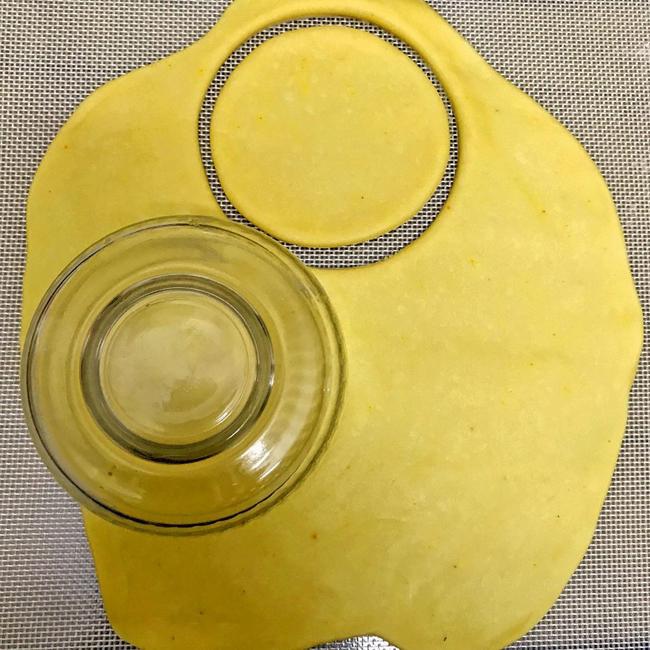 - Bột sau khi bạn hòa và nhào nặn cho đạt yêu cầu và để 30 phút thì mang ra tạo hình. Bạn dùng cây cán bột cán mỏng. Rắc bột áo là bột mì khô để chống dính, cán bột mỏng rồi lấy một cái bát ăn cơm hoặc bát to hơn ấn xuống làm khuôn thành hình tròn. Thực hiện bước làm bánh này cho đến khi hết bột.
