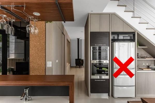 Không đặt tủ lạnh dưới gầm cầu thang: Tủ lạnh đặt dưới cầu thang thường xuất hiện ở những gia đình sống trong căn hộ chung cư nhỏ hoặc những gia đình có diện tích nhà ở không rộng rãi.
