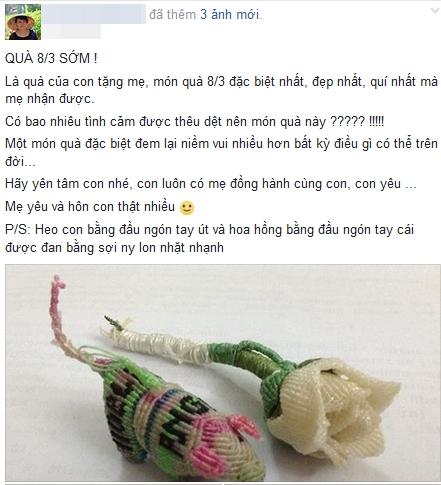 "Món quà 8/3 đặc biệt nhất, đẹp nhất, quí nhất mà mẹ nhận được, có bao nhiêu tình cảm được thêu dệt nên món quà này? Một món quà đặc biệt đem lại niềm vui nhiều hơn bất kỳ điều gì có thể trên đời... Heo con bằng đầu ngón tay út và hoa hồng bằng đầu ngón tay cái được đan bằng sợi ny lon nhặt nhạnh", bà Hồ Mai Phương xúc động cho biết.