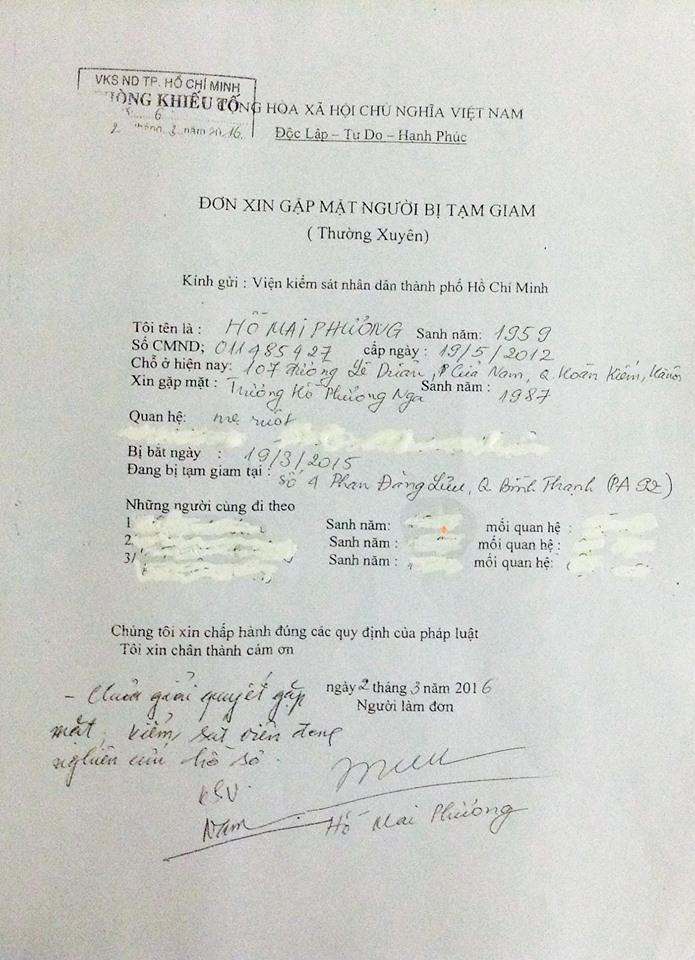 Đơn xin gặp mặt con gái của bà Hồ Mai Phương