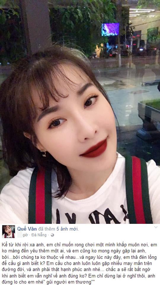 "Kể từ khi rời xa anh, em chỉ muốn rong chơi một mình khắp muôn nơi. Em không màng đến yêu thêm một ai và em cũng không mong ngày gặp lại anh. Bởi...chúng ta không thuộc về nhau", Quế Vân viết.