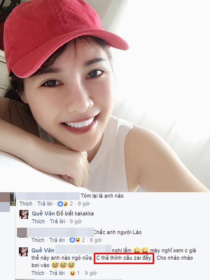 Trong số đó, câu hỏi tò mò: "Tóm lại là anh nào?" của người bạn Quế Vân nhận được nhiều chú ý. Đáp lại người em thân thiết, chân dài có câu trả lời hóm hỉnh dễ thương: "Đố biết... nghi lắm, em nghĩ xem chị già thế này anh nào ngó nữa. Chị thả thính câu trai đấy.... cho nháo nhào bơi vào".