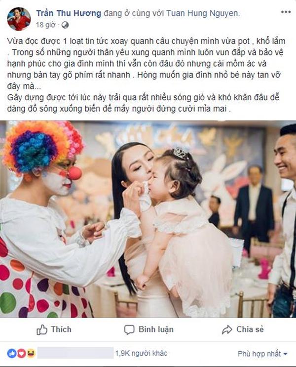 Thu Hương viết trên trang cá nhân: "Tôi cũng như bao nhiêu người khác mà thôi, hà cớ gì khi tôi chia sẻ câu chuyện lên các bạn lại chụp mũ và quy tội đó là câu chuyện của gia đình tôi. Nếu tôi muốn đăng chuyện gia đình cho mọi người đọc, tầm đã đến nước không còn gì với nhau đăng chuyện gia đình như vậy thì cần gì tôi phải viết đấy là câu chuyện của người khác không phải của tôi...