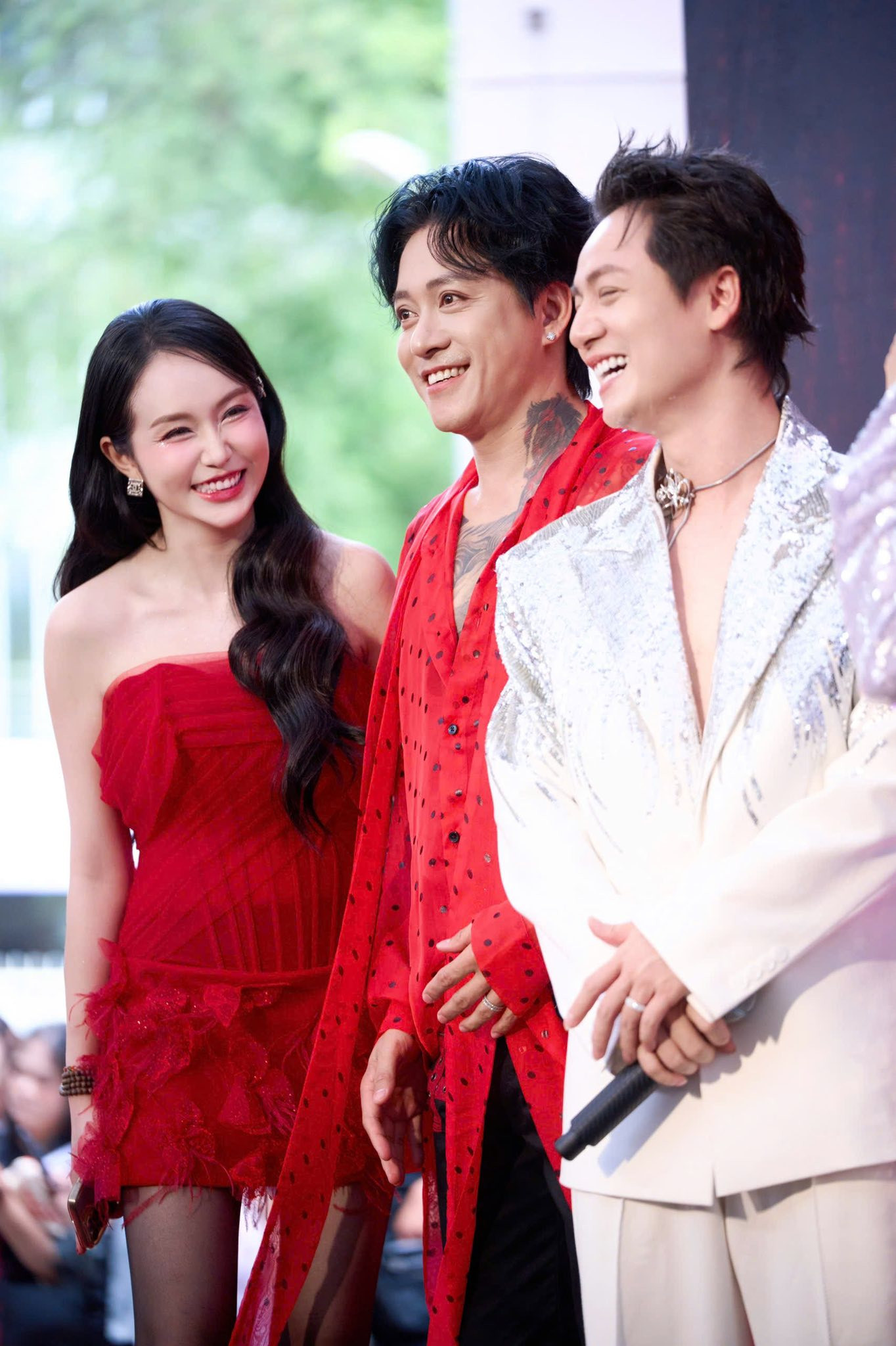 Theo đó, nam ca sĩ diện chiếc áo sơ mi chấm bimàu đỏ xuyên thấu nổi bật, tóc tai tạo kiểu "bảnh trai" các thứ. Trong khi đó, bà xã Hương Baby cũng lựa chọn đầm đỏ cúp ngực đồng điệu tôn trọn làn da trắng nõn nà.