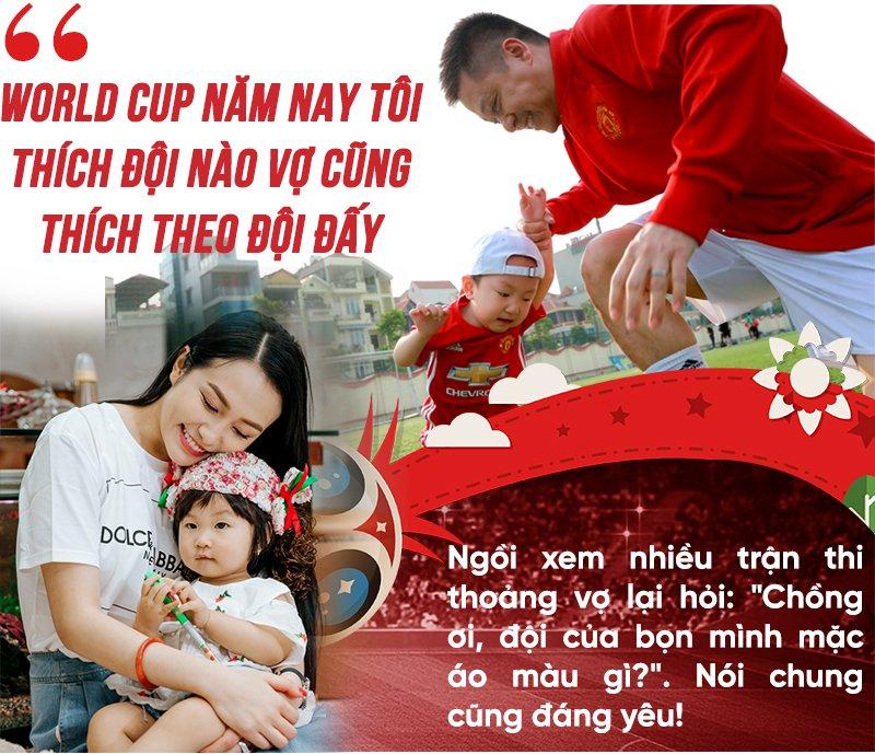 Vợ tôi rất yêu bóng đá và hay ngồi xem cùng chồng mỗi tội không biết đội nào đá với đội nào. World Cup năm nay tôi thích đội nào cô ấy cũng thích và cổ vũ cho đội đấy. Ngồi xem với nhau nhiều trận thi thoảng vợ lại hỏi khó: "Chồng ơi, đội của bọn mình mặc áo màu gì?". Nói chung cũng đáng yêu! (cười)