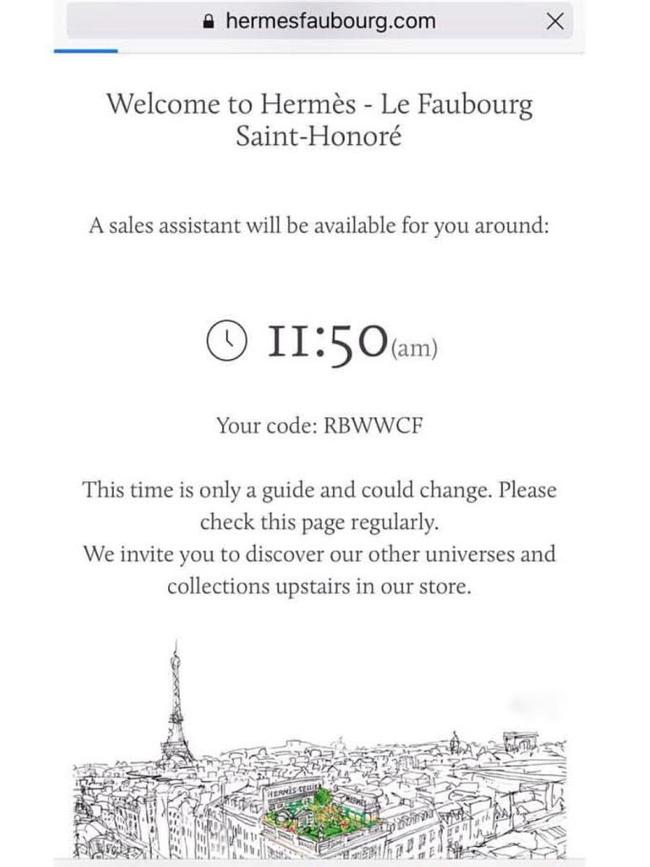 Sau khi đã lấy số thành công, bạn sẽ nhận được một tin nhắn thông báo về thời gian bạn có thể quay lại store để mua túi (thường là từ 10 phút - 2 tiếng sau đó). 15 phút trước giờ hẹn, bạn sẽ nhận được tin nhắn thứ 2 thông báo rằng nhân viên chuẩn bị sẵn sàng gặp bạn. Đến giờ hẹn, bạn sẽ nhận được tin nhắn thứ 3 cung cấp tên nhân viên cùng địa điểm giao dịch chính xác. Khi quay lại store, bạn sẽ cần trình diện tin nhắn này để được phục vụ.