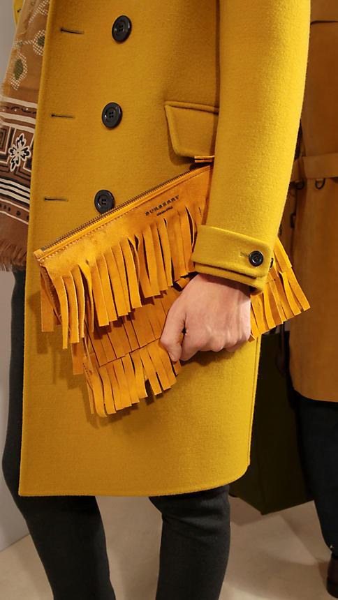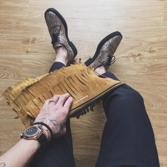 Chiếc clutch rua tua đính họa tiết vô cùng bắt mắt được xem như điểm nhấn nhá hoàn hảo cho toàn bộ set đồ của anh chàng.