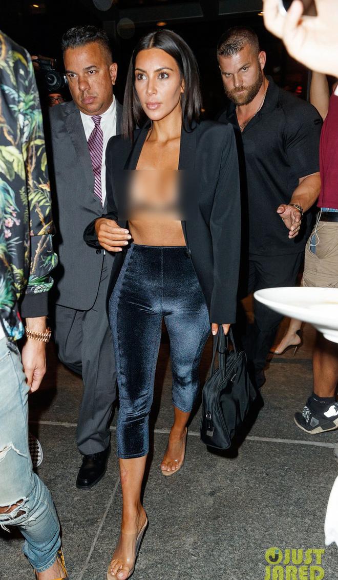 Ở tuổi 36, Kim Kardashian chưa bao giờ thôi tình yêu với thời trang hở hang bạo liệt. Lần gần đây nhất cô ra đường với chiếc áo blazer khoác ngoài, bên trong chỉ mặc đúng một chiếc áo bra mỏng manh.