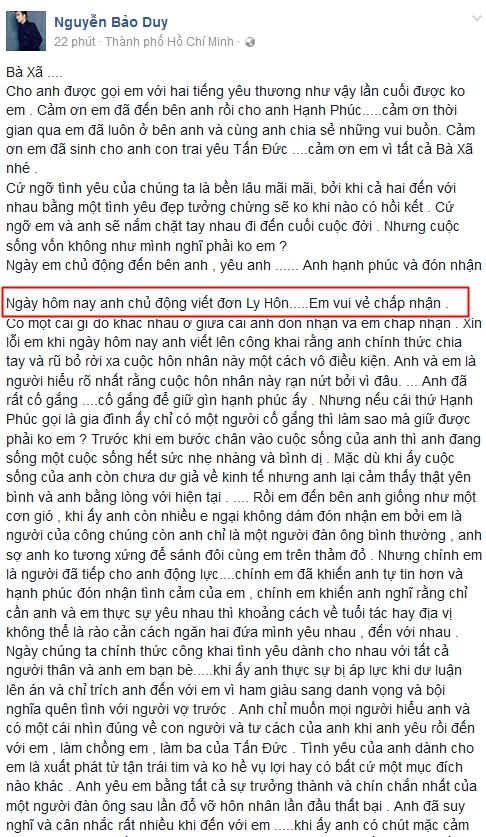 "Bà Xã ....cho anh được gọi em với hai tiếng yêu thương như vậy lần cuối được không em. Cảm ơn em đã đến bên anh rồi cho anh hạnh phúc.....cảm ơn thời gian qua em đã luôn ở bên anh và cùng anh chia sẻ những vui buồn. Cảm ơn em đã sinh cho anh con trai yêu Tấn Đức ....cảm ơn em vì tất cả bà xã nhé. Cứ ngỡ tình yêu của chúng ta là bền lâu mãi mãi, bởi khi cả hai đến với nhau bằng một tình yêu đẹp tưởng chừng sẽ không khi nào có hồi kết. Cứ ngỡ em và anh sẽ nắm chặt tay nhau đi đến cuối cuộc đời nhưng cuộc sống vốn không như mình nghĩ phải không em?