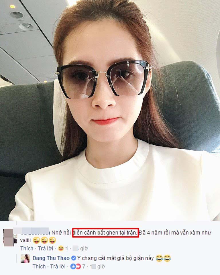 Trong số đó, câu trả lời: "Y trang cái mặt giả bộ giận này" của Thu Thảo khi người bạn nhắc lại chuyện quá khứ nhận được sự quan tâm đặc biệt. Theo người bạn nhận xét, biểu cảm của hoa hậu trong clip vẫn xàm như hồi diễn cảnh bắt ghen tại trận cách đây 4 năm. "Nhớ hồi diễn cảnh bắt ghen tại trận. Đã 4 năm rồi mà vẫn xàm như vậy", chia sẻ của người bạn.