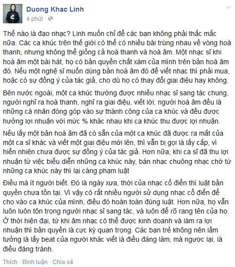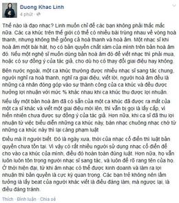 Dòng trạng thái nhạc sĩ Dương Khắc Linh đưa quan điểm về vấn đề đạo nhạc cách đây hơn 4 năm.