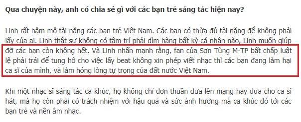 Dương Khắc Linh cũng từng nhắn nhủ fan Sơn Tùng M-TP không nên bất chấp tung hô việc lấy beat viết nhạc mà không xin phép