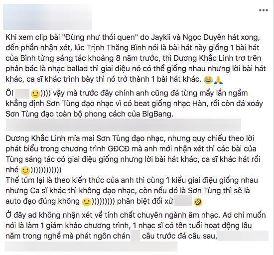 Dòng trạng thái được Dương Khắc Linh đăng tải đúng thời điểm ca khúc Em đừng đi của Sơn Tùng M-TP dính nghi vấn sao chép ca khúc quốc tế khiến người hâm mộ cho rằng nhạc sĩ đang gián tiếp khẳng định "đàn em" đạo nhái vì có beat giống nhạc Hàn.