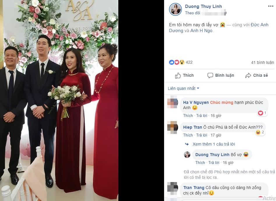 Bên cạnh sự nổi tiếng của bản thân, khán giả cũng đặc biệt quan tâm đến người thân trong gia đình mỹ nhân họ Dương khi mới đây cô bất ngờ tiết lộ thông tin em trai lấy vợ. Theo đó, đăng tải hình ảnh người em trong lễ cưới cùng cô dâu và bố mẹ - Thùy Linh hào hứng thông báo: "Em tôi hôm nay đi lấy vợ".