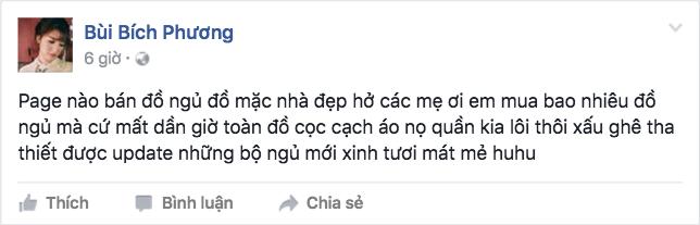 Mới đây, nữ ca sĩ Bích Phương đăng đàn hỏi các fan địa chỉ bán đồ ngủ đẹp. "Page nào bán đồ ngủ đồ mặc nhà đẹp hở các mẹ ơi. Em mua bao nhiêu đồ ngủ mà cứ mất dần giờ toàn đồ cọc cạch áo nọ quần kia lôi thôi xấu ghê. Tha thiết được update những bộ ngủ mới xinh tươi mát mẻ" - Bích Phương viết.