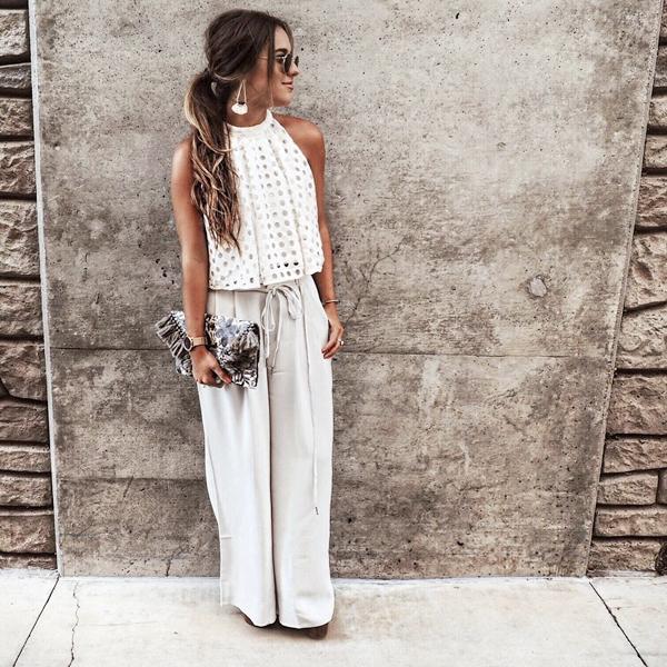 Gina Ybarra, "chủ xị" trang blog Hunt for Styles phô trọn vẻ lôi cuốn nhờ bộ đôi áo cổ yếm và quần ống rộng màu trắng ngà. Song song cùng đôi sandals giúp cô "ăn gian chiều cao", clutch họa tiết cũng là phụ kiện nhấn nhá thành công, làm tăng sức hút cho bộ trang phục.