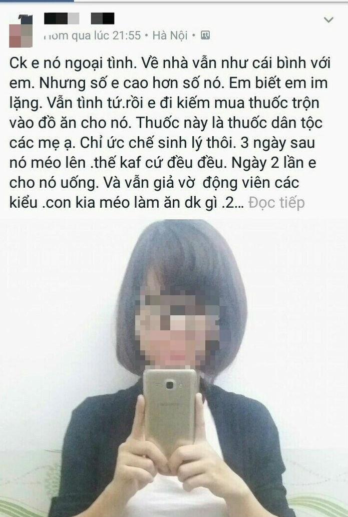 “Chồng em ngoại tình nhưng về nhà vẫn đối xử tình cảm với vợ. Dù đau đớn nhưng em vẫn im lặng như chưa có chuyện gì xảy ra. Vẫn tình tứ với chồng. Rồi em tìm mua thuốc trộn vào thức ăn cho chồng. Thuốc này là thuốc dân tộc các mẹ ạ, chỉ ức chế sinh lí tạm thời thôi.
