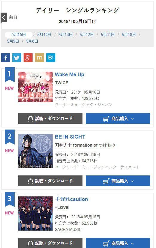 Hôm 16/5, TWICE đã phát hành single tiếng Nhật mới mang tên Wake Me Up. Sau 1 ngày ra mắt, "Wake Me Up" đã tẩu tán được 129.275 bản và vượt kỉ lục 117.486 bản trước đó của Candy Pop.