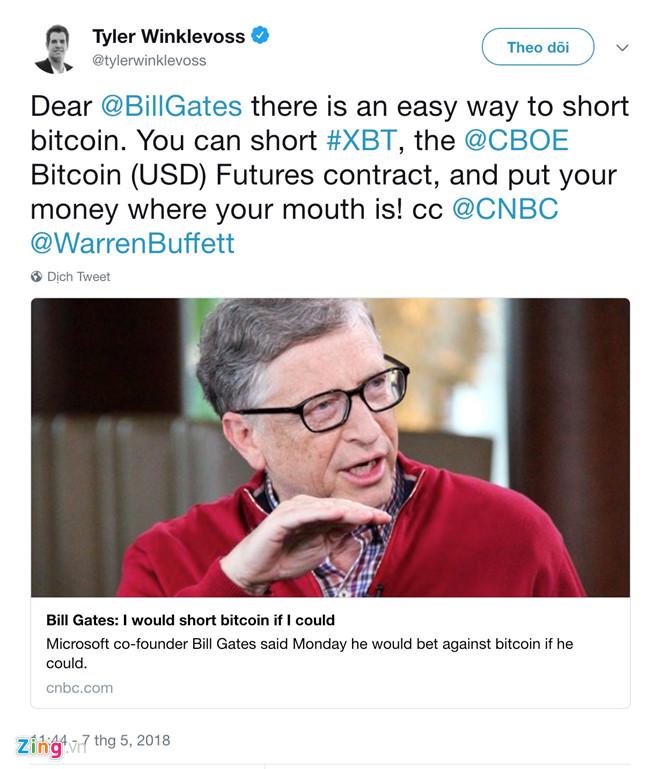 "Bill Gates thân mến. Có một cách dễ dàng để giảm giá Bitcoin. Ông có thể đạp giá #XTB (tên gọi khác của Bitcoin), hợp đồng Bitcoin tương lai trên sàn CBOE và cố làm được thay vì chém gió", Winklevoss tweet trên trang cá nhân.