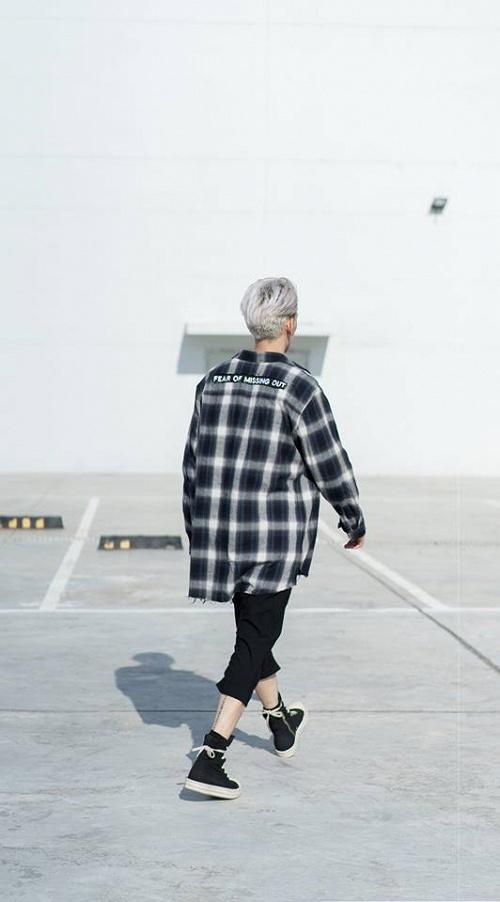 Stylist “phù thủy” Hoàng Ku tiên phong với kiểu áo “unfinished shirt” màu đen mix cùng quần denim rách và boots da lộn - một công thức kết hợp trang phục cơ bản và phổ biến.