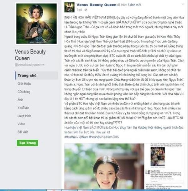 Mới đây, mạng xã hội lan truyền thông tin thí sinh Hoa hậu Việt Nam 2016 – Lê Trần Ngọc Trân – từng tham gia cuộc thi Kim Mộc Hỏa Thổ (Hoa hậu Việt Nam Thế giới 2014), tại Nhật Bản. Nguồn tin này cho hay cô đạt danh hiệu á hậu. Tuy nhiên, thí sinh bị tước danh hiệu sau đó không lâu vì bị phát hiện giả mạo chữ ký của cục Nghệ thuật Biểu diễn. Hiện status (trạng thái) tố “nàng thơ xứ Huế” đã bị xóa.