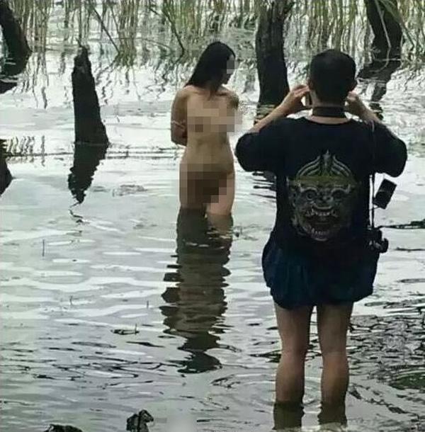 Cô gái vô tư chụp ảnh khỏa thân giữa hồ.