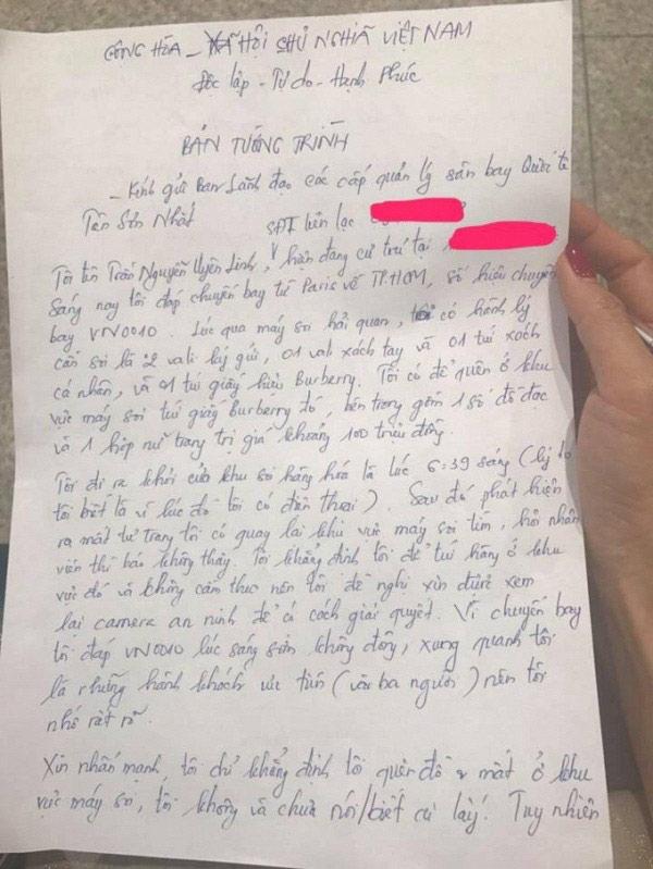Theo đó, nữ ca sĩ cho biết: "Linh đáp chuyến bay từ Paris về TP.HCM. Sau khi qua máy soi kiểm tra hải quan, Linh để quên 1 trong 5 kiện hành lý - đó là 1 túi giấy hiệu Burberry, bên trong có một số đồ như áo thun, hộp mắt kính, và 1 hộp nữ trang, giá trị khoảng trên dưới 100 triệu. Do đi một mình lại nhiều hành lý, nên Linh để quên trên thành máy soi."