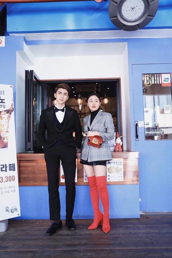 Văn Mai Hương xuất hiện với blazer vest kẻ mix cùng quần short ngắn, boots đỏ sành điệu và túi hàng hiệu. Trong khi đó diễn viên Bình An lại mặc suit bảnh bao.