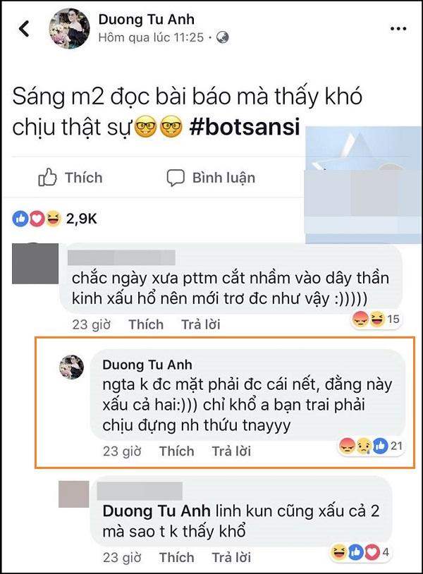 Hashtag "bớt sân si" của Tú Anh chĩa thẳng vào một đối tượng nào đó. Trả lời bình luận của bạn bè, Á hậu mỉa mai một cô gái xấu cả mặt lẫn nết, khiến cho người yêu phải chịu khổ.