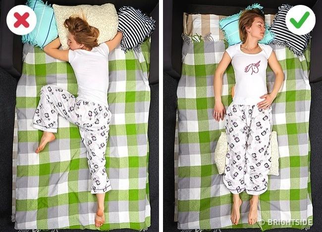 Nằm trên những chiếc nệm quá mềm hoặc sai tư thế sẽ khiến cột sống bị ảnh hưởng và gây đau lưng. Nếu bạn có thói quen nằm thẳng, hãy dùng một chiếc khăn có độ dày vừa phải và đặt dưới lưng để cải thiện tình trạng này. Tư thế bào thai sẽ phù hợp cho những ai có thói quen nằm nghiêng. Ở tư thế nằm này bạn nên kẹp chiếc gối ở giữa hai chân và giữ lưng thẳng là tốt nhất. Bạn cũng đừng quên kiểm tra và lựa chọn những chiếc nệm phù hợp với sức khỏe.