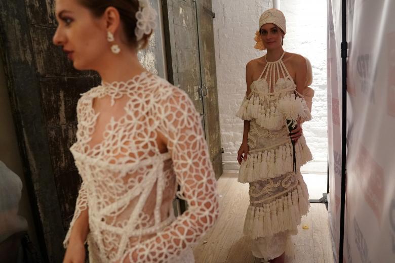Các NTK bận rộn với người mẫu trước giờ trình diễn. Nhiều người bày tỏ thật sự rất thích thú với những mẫu váy đặc biệt này.