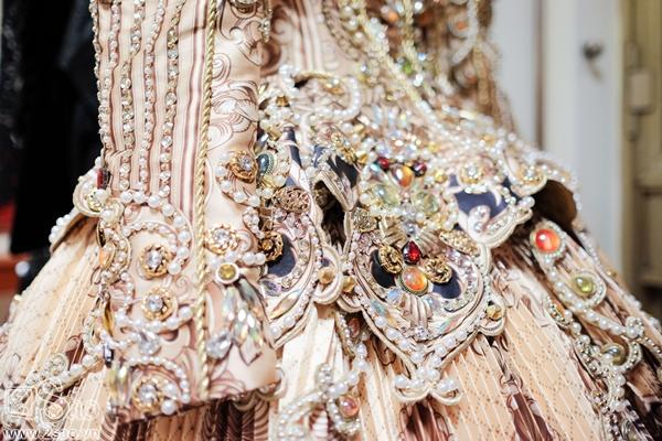 Bộ váy mang phong cách cổ điển với sắc sa kim hoàng gia của NTK Công Trí được trang trí cầu kỳ .