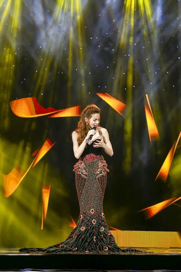 Chiếc váy được thiết kế với phần hông ôm sát và xòe dưới gót chân giúp cho Hà Hồ giống như một chú chim công rực rỡ.