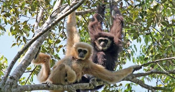 Vượn Cao Vít không đuôi, tay dài, con trưởng thành nặng khoảng 7-8 kg. Con đực toàn thân màu đen và có chỏm mào trên đỉnh đầu; con cái trưởng thành lông vàng, có mảng lông đen và không có chỏm; con non lông màu vàng. Ảnh: TTXVN.