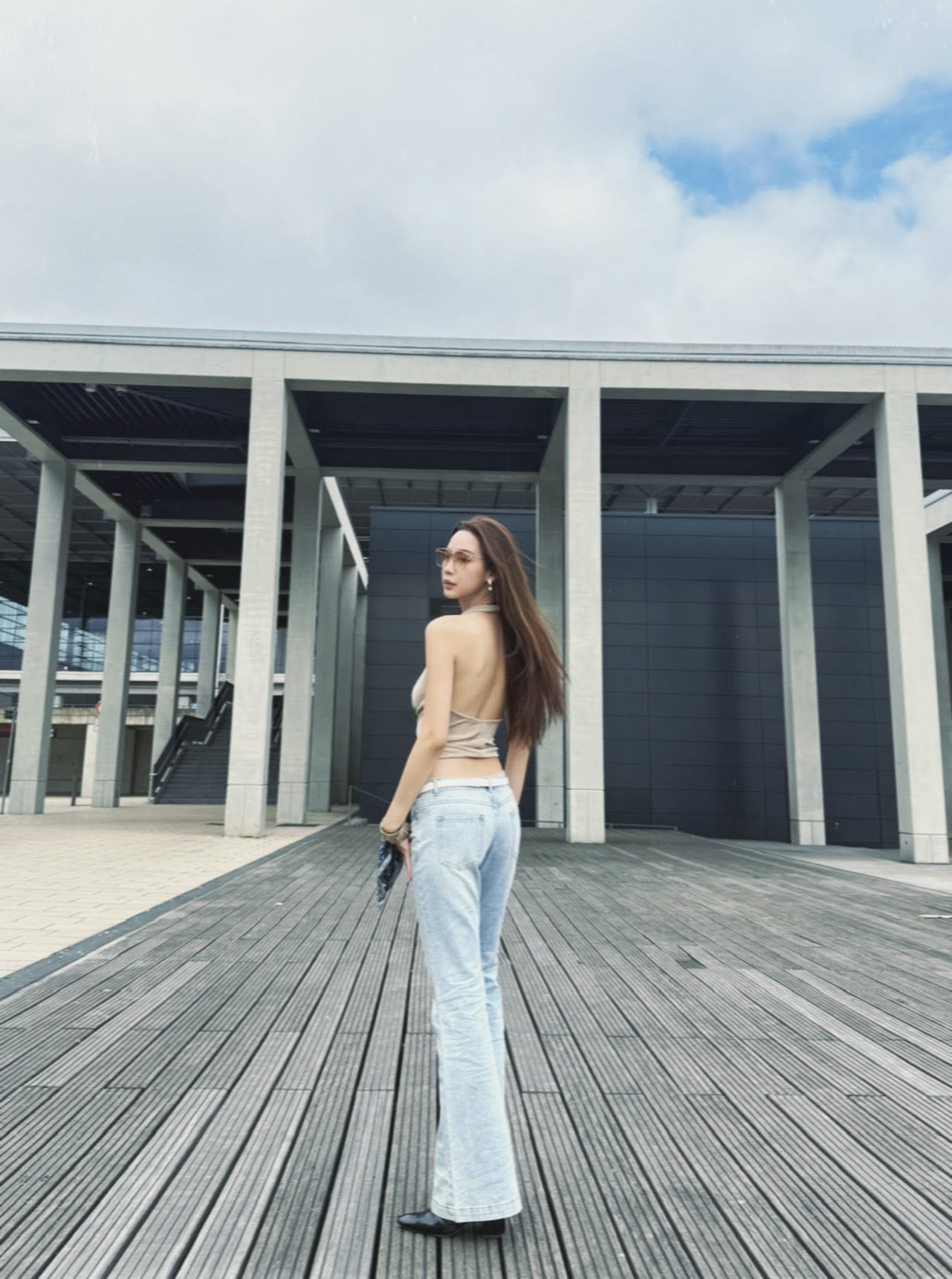 Set đồ vừa sexy vừa cá tính của Bảo Ngọc khi mix quần jean và áo dây khoe tấm lưng trần.
