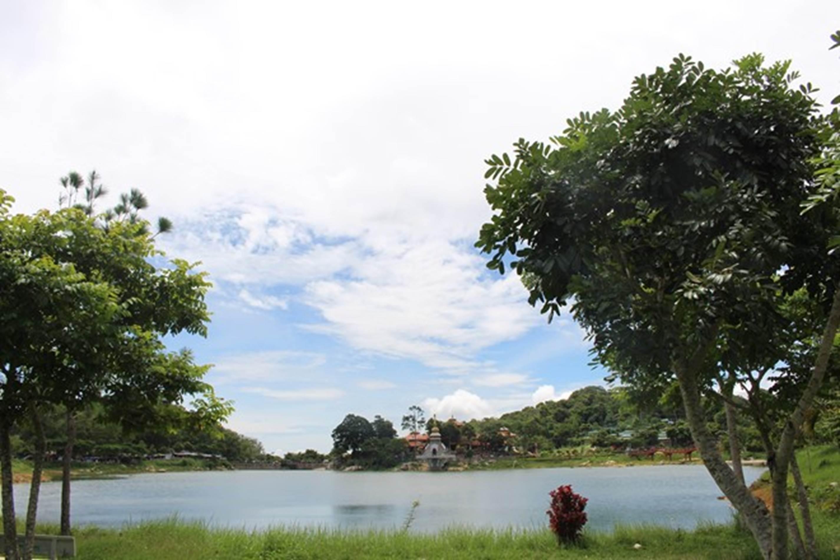 Trên núi có một hồ nước lớn, tạo nên khung cảnh nên thơ và làm giảm cảm giác nóng nực ngày hè.