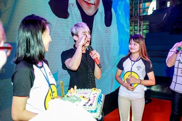Trong khi nam ca sĩ trao tặng những con thú bông đáng yêu cho các fan tham gia trò chơi thì anh cũng bất ngờ nhận về món quà sinh nhật muộn từ fanclub Thái Nguyên. Đó là chiếc bánh kem có dòng chữ “FC Thái Nguyên chúc mừng sinh nhật Tùng chân ngắn” khiến cả khán vòng cười vỡ òa.