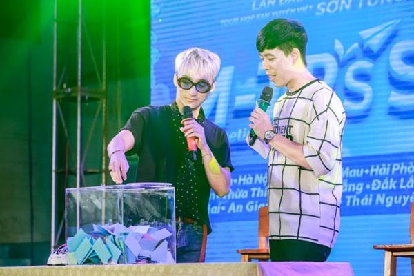 Một trong những lá thư viết tay thú vị khiến cả khán phòng xôn xao đó là màn tự nhận làm “vợ tương lai” của Sơn Tùng. Sau khi nhận được lời nhắn này, anh chàng hí hửng tìm người “vợ tương lai” giữa biển người nhưng vô cùng bất ngờ khi có quá nhiều fan nữ giơ tay. Càng bất ngờ hơn khi MC công bố trong số đó có cả những fanboy vui tính muốn giơ tay góp vui cùng “đồng bọn”.