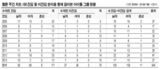 Đối với nhóm nhạc nam: Năm 2005 có 19 nhóm, năm 2006 có 10 nhóm, năm 2007 có 10 nhóm,… và năm 2013 có 17 nhóm. Còn đối với các nhóm nhạc nữ: năm 2005 có 16 nhóm, năm 2006 có 4 nhóm, năm 2007 có 11 nhóm… và năm 2013 có 10 nhóm. Tổng số các nhóm nhạc thần tượng từ năm 2005 cho đến nay là 244.