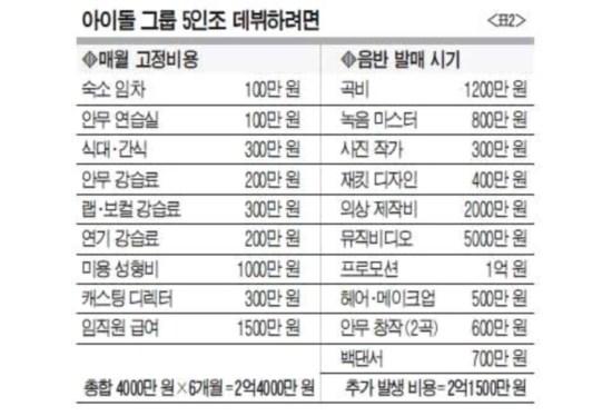 Chúng ta có thể nói “sản xuất nhóm nhạc thần tượng” một cách dễ dàng nhưng có một chi phí khổng lồ dành cho cả quá trình này. Để ra mắt một nhóm nhạc thần tượng phải tiêu tốn ít nhất 400.000 đô la và đây mới chỉ là chi phí của các công ty nhỏ và trung.