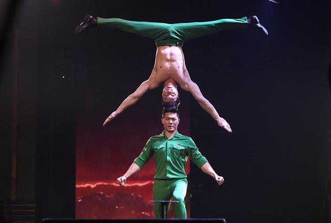 Phần trình diễn trong đêm chung kết Britian’s Got Talent chính là tiết mục khi người anh đưa người em từ chiến trường về, bước trên những cây cột lên cao dần mà giới chuyên môn ngành xiếc gọi là Mai hoa thung.
