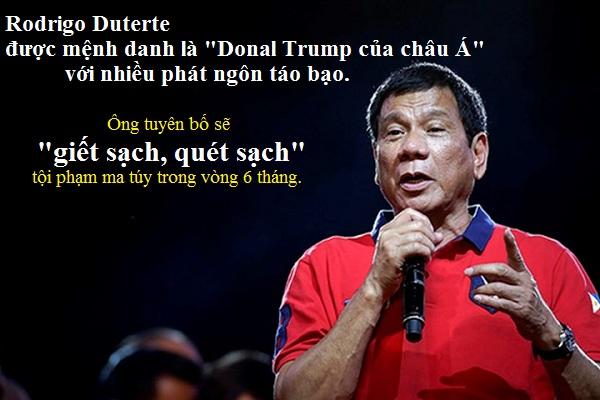 (2Sao) - Được mệnh danh là Donald Trump của châu Á với nhiều phát ngôn táo bạo, Rodrigo Duterte đã tuyên bố trước người dân Philippines rằng ông sẽ "giết sạch, quét sạch” tội phạm ma túy trong vòng 6 tháng.