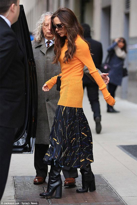 Diện áo len cao cổ vàng kết hợp chân váy xếp ly, boots và xõa tóc xoăn nhẹ, Victoria tự tin tạo dáng uyển chuyển trong mỗi bước đi. Nhiều người còn khen ngợi cô còn đẹp hơn của người mẫu trên sàn diễn.