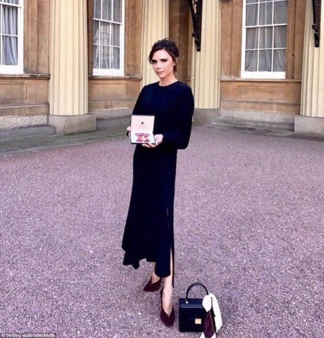 Xuất hiện tại cung điện Buckingham (Luân Đôn), bà mẹ 4 con khéo khoe sắc vóc eo thon dù đã ở tuổi 43 trong thiết kế đầm đen dài sát gót, kết hợp với giày cao gót tôn lên vẻ sang trọng quý phái. Tham gia sự kiện cùng nhà thiết kế còn có bố mẹ cô và ông xã David. Cách đây 13 năm, ông xã Vic cũng từng vinh hạnh khi nhận được giải thưởng ý nghĩa này.