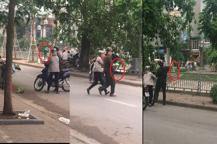 Hình ảnh cán bộ tự quản phường ném cân của người phụ nữ bán hàng rong xuống sông được ghi lại. (Ảnh chụp màn hình)