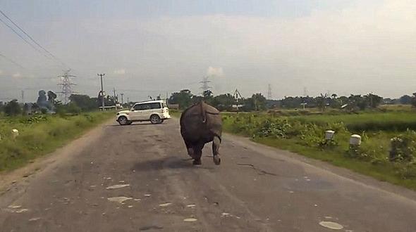 Mới đây, một video được đăng trên mạng cho thấy một con tê giác trưởng thành đi từ một cánh đồng lúa ra và bỗng nhiên hung hăng lao về phía một người đang đi xe máy trên đường. Hoảng sợ trước tình huống này, người đi xe máy vội vã quẳng xe và bỏ chạy, trong khi con tê giác nặng 2,5 tấn với chiếc sừng nhọn hoắt hùng hục đuổi theo.