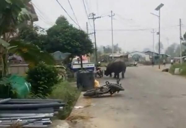 Sau đó, con tê giác đột ngột đổi ý và chạy theo hướng ngược lại, xô đổ một chiếc xe máy đang đỗ trong khi nhiều người dân la hét sợ hãi.