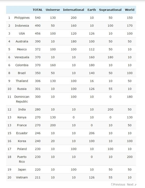Trước đó, nhờ thành tích tích top 8 Hoa hậu Trái đất của Nam Em và top 25 Hoa hậu Siêu quốc gia của Khả Trang mà Việt Nam leo lên hạng 20 trên "Bản đồ sắc đẹp thế giới 2016".