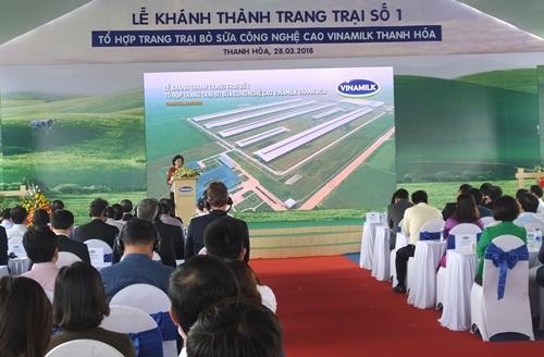 Phát biểu tại buổi lễ, bà Mai Kiều Liên- Tổng Giám đốc Vinamilk cho biết, việc đưa trang trại số 1- Tổ hợp trang trại bò sữa công nghệ cao Vinamilk Thanh Hóa vào hoạt động sẽ không chỉ giúp Vinamilk đạt được các mục tiêu về kinh doanh mà còn góp phần giúp ngành nông nghiệp chăn nuôi bò sữa địa phương và cả nước phát triển theo hướng bền vững, tiên tiến.